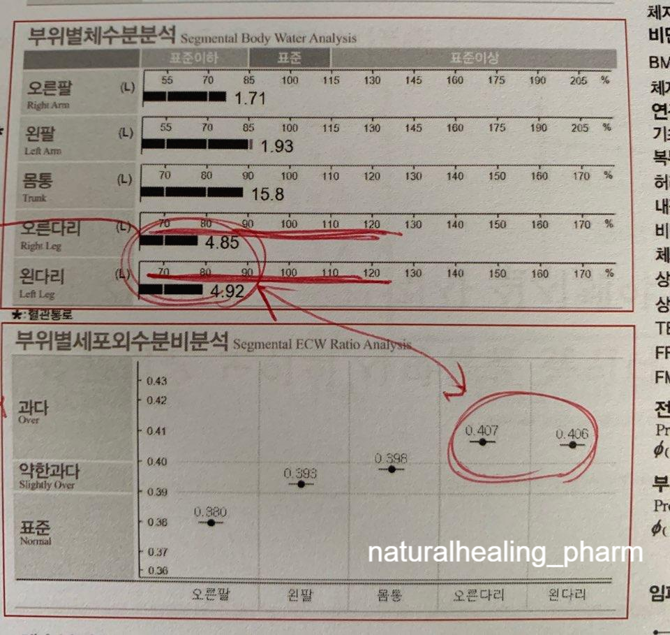 체수분 구성을 통해서 부종을 확인할 수 있습니다. 또한 부종 부위를 통해 영양과 순환의 불균형을 확인할 수 있습니다. 일단 체수분구성을 보면 일단 막대그래프가 표준 구역 안에 존재해야 합니다. 그리고 체수분, 세포내수분, 세포외수분을 보게 되는데, 체수분은 세포내수분과 세외수분의 합산 값이고, 세포내수분은 '세포외수분/총 체수분' 입니다. 이때 세포외수분의 값이 많게 될 경우 부종으로 판단됩니다. 더 정확하게 부위별 부종 부위를 알기 위해서는 아래 부위별체수분분석과 부위별세포외수분비분석을 비교해야 합니다. 일단 부위별세포외수분비분석에서 표준을 벗어나 약한 과다, 과다로 넘어갔다면 그것은 부종으로 판단하게 됩니다. 하지만 이때 부위별체수분분석에서 아래의 부위별세포외수분분석에서는 과다, 약한 과다였던 것이 표준이하에 해당하게 된다면, 이것은 부종이 아니라 근육이 부족하여 수치가 올라간 것으로 보게 됩니다. 아래에 그림은 바로 근육이 없어서 나온 사람의 그래프입니다.